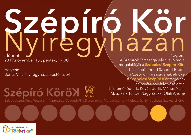 November 15-én megalakul a Szabolcsi Szépíró Kör, a Bencs Villában. Az est folytatásaként a Szépíró Kör tagjainak és barátainak felolvasóestje várja az irodalombarátokat.