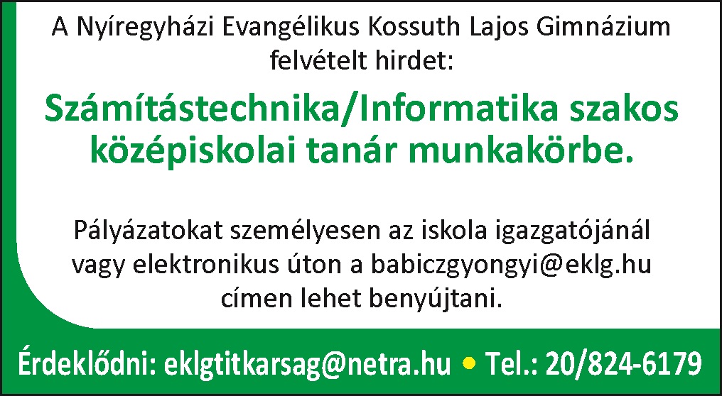 Számítástechnika, informatika szakos középiskolai tanárt keresnek a Kossuth Gimnáziumban