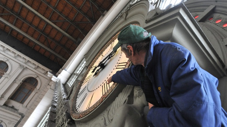 Terstyanszky Sándor, a MÁV óraközpontjának dolgozója ellenőrzi a Keleti pályaudvar nagyórájának számlapját 2012. október 26-án. A Frankfurt melletti DCF77 rádióadó pontosidő-jelét hasznosító óraközpont látja el elektromos impulzusokkal az ország vasúti pályaudvarainak mellékóráit. MTI Fotó: Máthé Zoltán