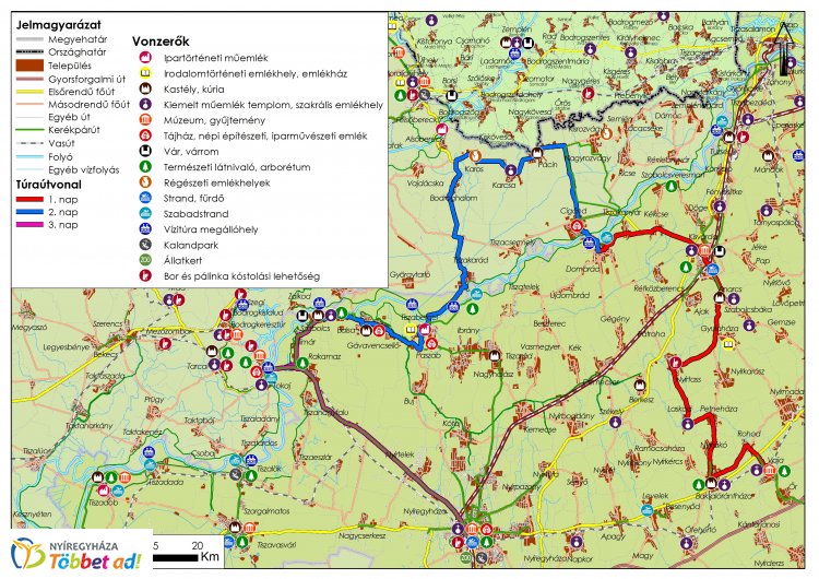 Szabolcs - Tokaj (10,8 km) – Rakamaz (5,7 km) – Nyírtelek (19,3 km) – Nyíregyháza (11 km)