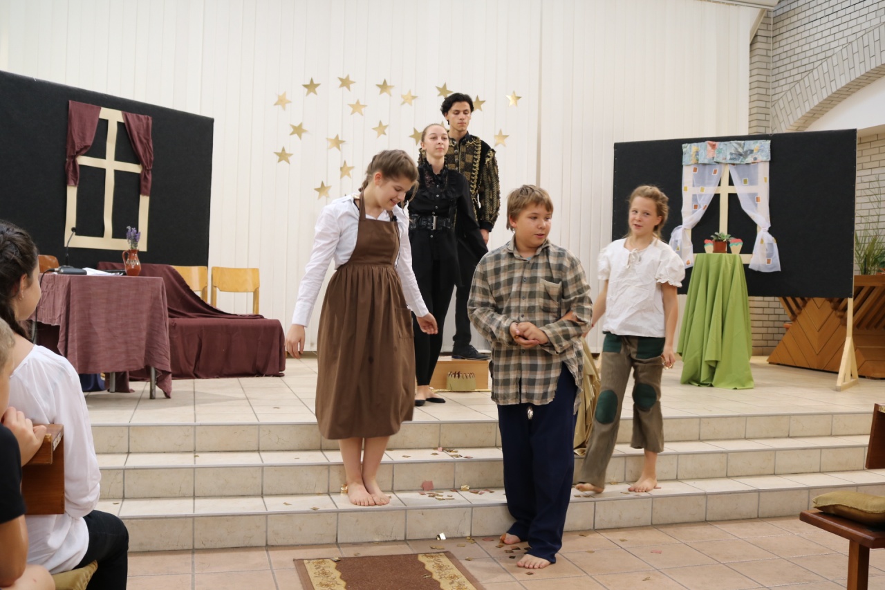 Tizenkét órától került sor A boldog herceg színdarab előadására. Mi, a szereplők már egy órával a kezdés előtt a kápolnában voltunk, csak a biztonság kedvéért. Felvettük a jelmezeinket, még utoljára átolvastuk a szövegünket, de mindenek előtt hihetetlenül izgultunk. Ahogyan lassan elkezdtek szállingózni a diákok a kápolnába, úgy a szereplők is elfoglalták helyüket. Aztán felcsendült az első jelenet zenéje. Elmondhatatlanul féltem attól, hogy talán elrontok majd valamit, vagy kihagyok egy sort. Szerencsére azonban fel sem tűnt, hogy rajtunk kívül mások is tartózkodnak a kápolnában, így minden pont olyan gördülékenyen ment, mint az utolsó próbákon. Véleményem szerint a többségnek tetszett az előadás, amit viszont biztosan tudok, az, hogy mi nagyon élveztük az egészet. A színdarabbal azonban nem ért véget a nap, hiszen néhány vállalkozó szellemű növendék előadta nekünk, hogy mit alkotott a nap folyamán.