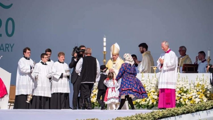 Szentimrés kisdiák adta át az ajándékot a pápának a budapesti miséjén