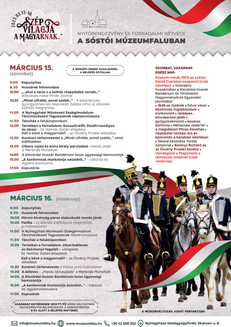 2025. március 15-én a Sóstói Múzeumfalu nyitórendezvényére hívják és várják régi és új látogatókat. A 9.00 órai kapunyitást követően 9.30 órakor a Kisvárdai Huszár Bandérium és Történelmi Hagyományőrző Egyesület lovas felvonulása fogadja a kedves látogatókat. A jóvágású huszárok egész nap vendégei lesznek a múzeumfalunak, akik Koszta Zoltán vezetésével, tüzérekkel, ágyúval, málhás szekerekkel interaktív huszártáborban mutatják be a nemes könnyűlovasok életét, mindennapjait. A „mese magáért beszél”, éppen ezért 10.00 órakor Pintér Zsolt élőszavas meséje várja a faluközpontba az érdeklődőket.