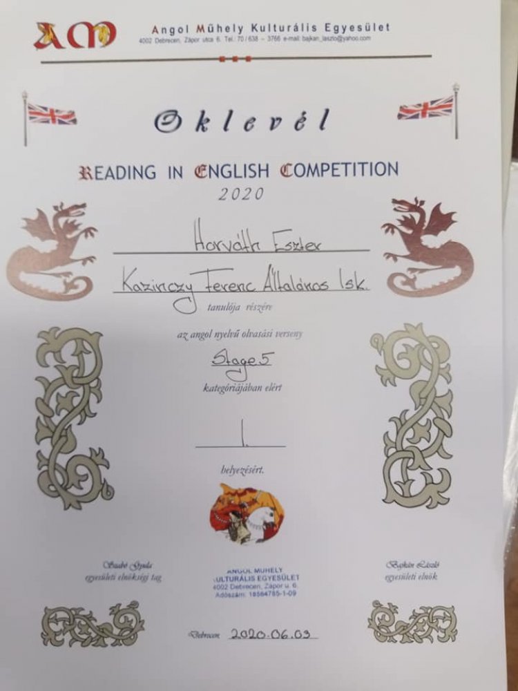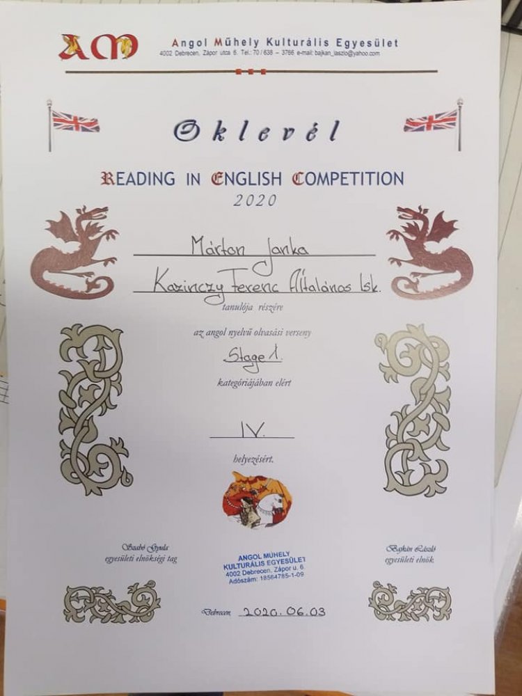 Még 2020. februárjában hirdette meg az Angol Műhely Kulturális Egyesület azt a regionális, több megyét érintő angol nyelvű versenyt, amire benevezett a Nyíregyházi Bem József Általános Iskola Kazinczy Ferenc Tagintézményének négy tanulója. Mátyásiné Pócsik Angéla tanítványai már több alkalommal vettek részt ezen a versenyen, hiszen van egy őszi és egy tavaszi forduló is, ahol bizonyíthatnak a diákok. A Kazinczy tanulói már az őszi fordulóban is szép eredményt értek, el, így egyértelmű volt, hogy a tavaszi versenyt is megpróbálják. A gyerekek márciusban kaptak egy-egy angol nyelvű regényt de a digitális tanrendre való áttérést követően a hozzá kapcsolódó három feladatsort már online töltötték ki. A szövegértési feladatokat önállóan oldották meg, de természetesen, amikor arra szükség volt, online segítette őket az iskolai angoltanár. A több megyét érintő megmérettetésben igen szoros volt a verseny, a bírálók a beküldött szövegértési feladatlapok alapján hozták meg a verseny végső eredményét.