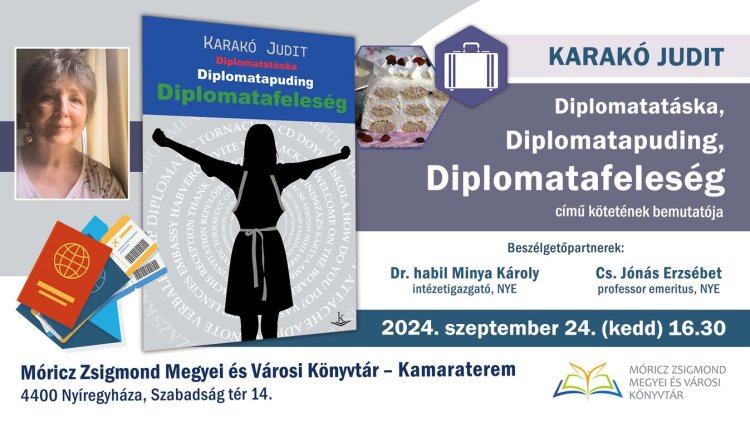 Karakó Judit: Diplomatatáska, Diplomatapuding, Diplomatafeleség című kötetének bemutatójára, melyen beszélgetőtársakként: Dr. habil Minya Károly (intézetigazgató, NYE) és Cs. Jónás Erzsébet (professor emeritus, NYE) vesznek részt.