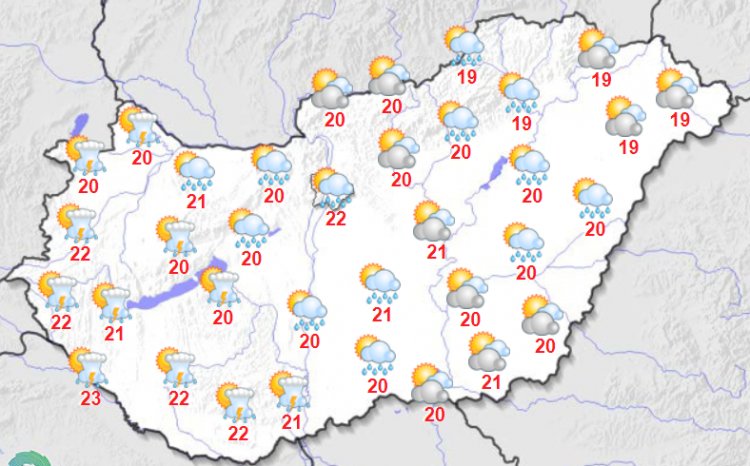 Az északnyugati szelet élénk lökések kísérhetik, emellett intenzív csapadékhullás idején viharos szélrohamok is lehetnek. A legmagasabb nappali hőmérséklet általában 18 és 24 fok között valószínű, de északkeleten néhol kissé hűvösebb is lehet. Késő estére 9 és 15 fok közé csökken a hőmérséklet.