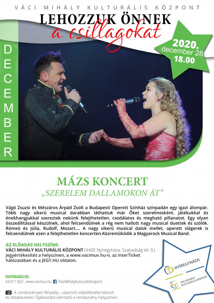 Vágó Zsuzsi és Mészáros Árpád Zsolt lép közönség elé december 28-án Nyíregyházán. A Váci Mihály Kulturális Központ színpadán népszerű musical dalok és operett slágerek csendülnek fel.