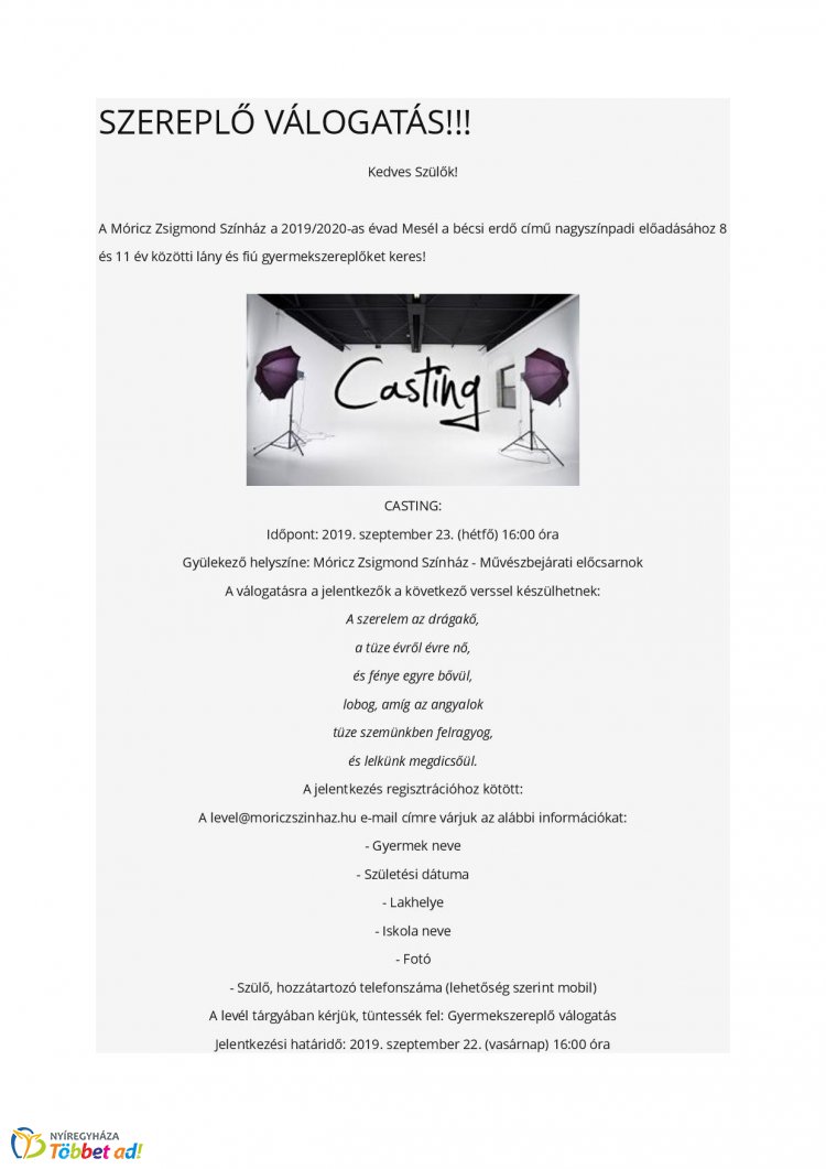 A Móricz Zsigmond Színház a 2019/2020-as évad Mesél a bécsi erdő című nagyszínpadi előadásához 8 és 11 év közötti lány és fiú gyermekszereplőket keres!