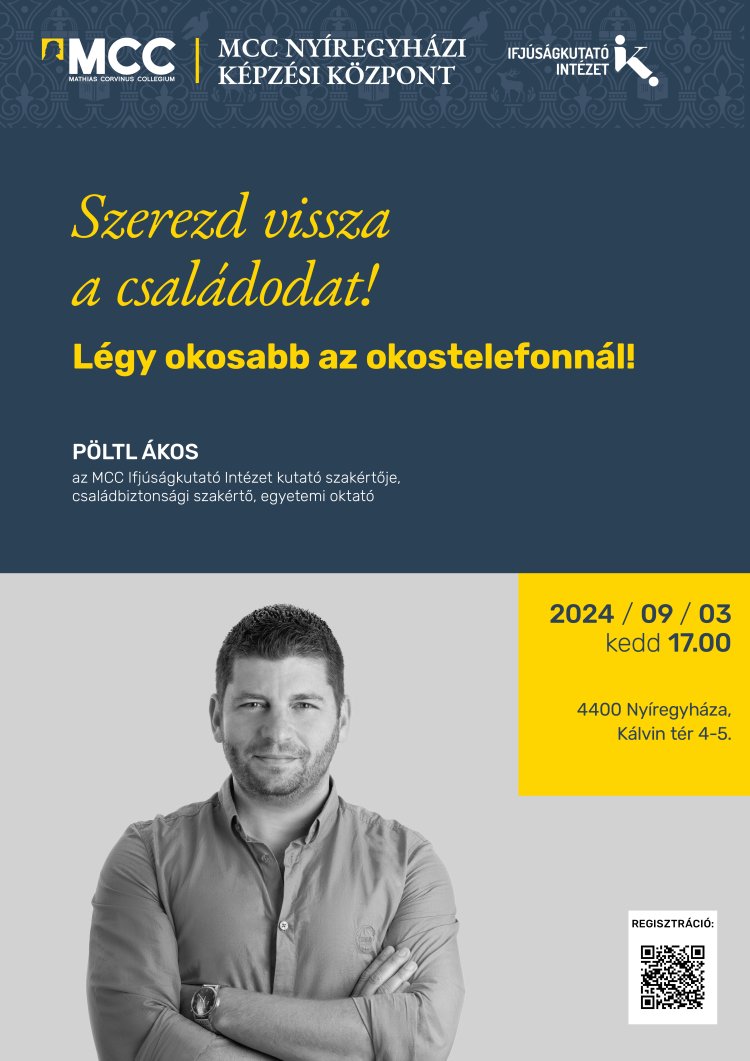 Meghívott előadónk: Pöltl Ákos az MCC Ifjúságkutató Intézet kutató szakértője, vezető oktató internethasználat és figyelemgazdaság témakörökben, családbiztonsági szakértő, egyetemi oktató.