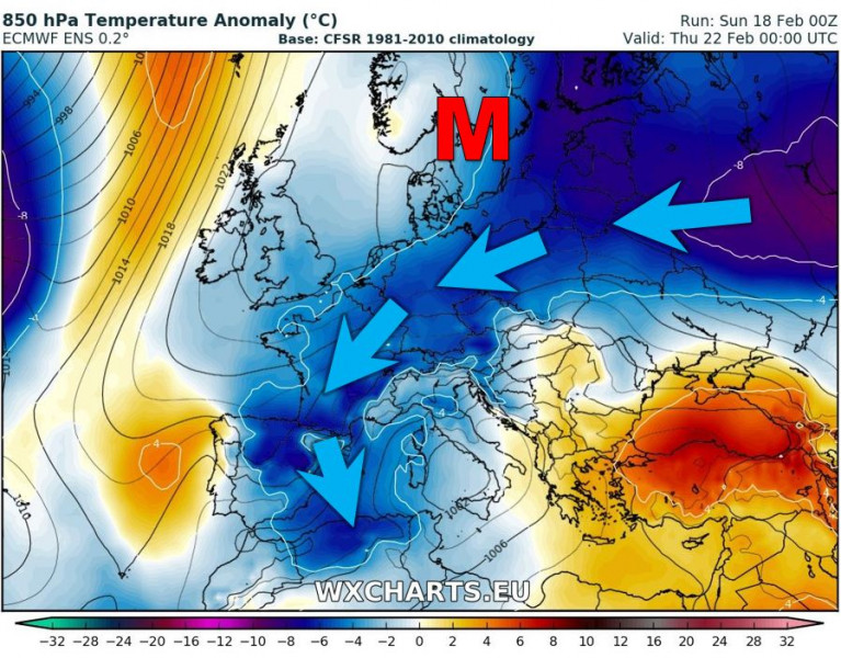 Ez azonban csak akkor tud Európa nyugatabbi részeire is eljutni, ha legyengül a nyugatias áramlás. Idén eddig ez még nem történt meg, mivel alapvetően a nyugatias áramlás volt a domináns, ami az óceán felől szállította térségünkbe az enyhébb levegőt, olykor tavaszias időjárást okozva januárban. Most azonban ez a nyugati áramlás legyengülni látszik.