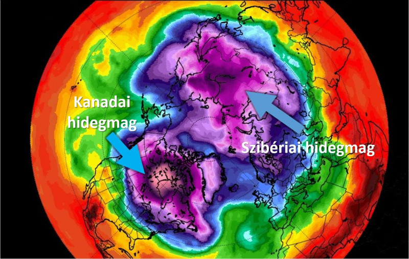 Az északi félteke leghidegebb területeinek (ún. hidegmagok) jelenlegi elhelyezkedése (Forrás: WXCharts)