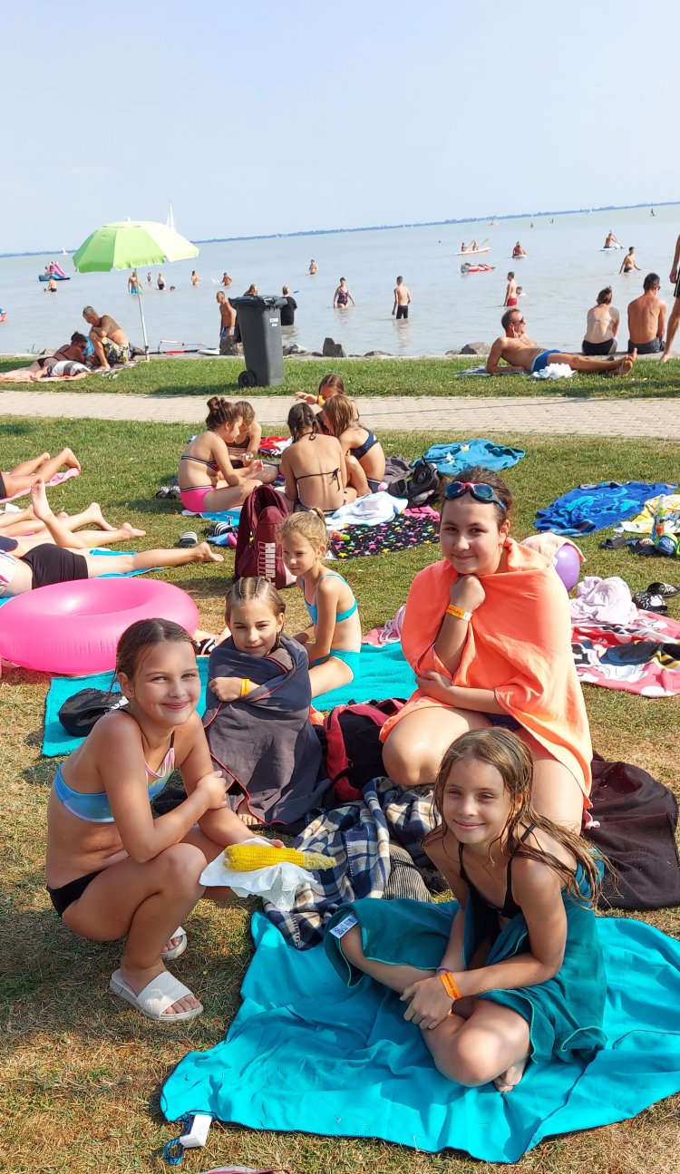 Ma később kelhettünk, hiszen délelőtt a táborban voltunk és a Balatonban lubickolhattunk. Ebéd után kicsit pihentünk, majd elindultunk Sümegre, ahol megnéztük a Fegyver- és kocsimúzeumot, majd a várjátékokat a hatalmas arénában. A lovagi torna a magyarok és mongolok között zajlott, ahol szoros küzdelemben végül a magyar lovagok győztek. Itt is volt lehetőségünk vásárolni, majd visszamentünk a táborba, ahol vacsoráztunk, játszottunk, majd lefeküdtünk aludni. Ezzel le is zárult a mai nap!”