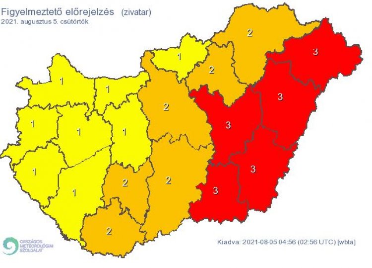 A délkeleti megyékben és az Alföld északi részein akár ezt meghaladó erősségű károkozó szélroham is előfordulhat. A legrosszabb forgatókönyv szerint ezeken a területeken nem kizárt a 100 kilométer/órát meghaladó szélroham sem az egyéb már felsorolt kísérőjelenségek mellett, így ezekre a területekre a piros riasztás is indokolt lehet.