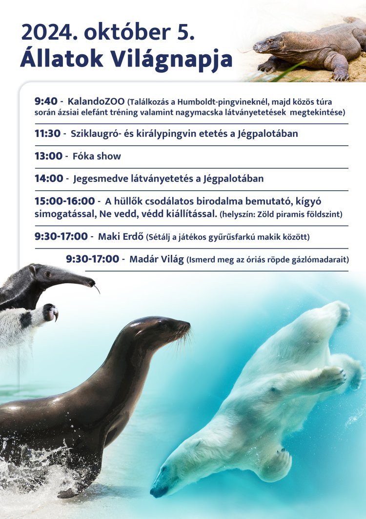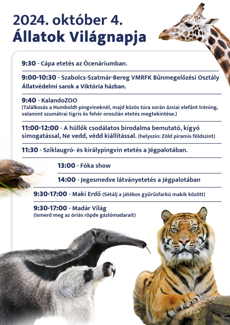 Az állatok világnapján, október 4-én (pénteken) és október 5-én (szombaton) egész napos programokkal, látványetetésekkel, bemutatókkal várja a látogatókat a Nyíregyházi Állatpark.