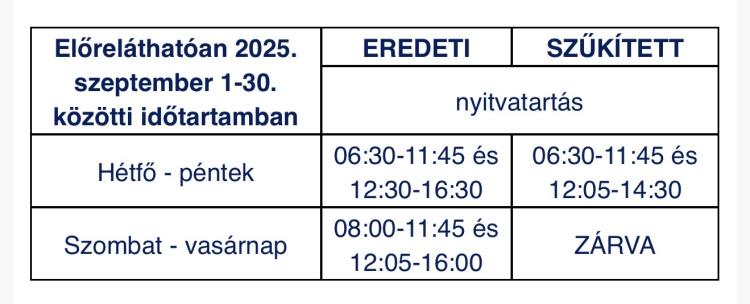 A MÁV Személyszállítási Zrt. felelős szolgáltatóként – a havária helyzetekben is – minden tőle telhetőt megtesz a közszolgáltatás zavartalan fenntartása érdekében, azonban ideiglenesen a Nyíregyháza, örökösföldi helyi autóbusz-végállomás jegypénztárát előreláthatóan 2025. szeptember 1-jétől (hétfő) 2025. szeptember 30-ig (kedd) terjedő időszakban az alábbi szűkített nyitvatartással tervezik üzemeltetni: