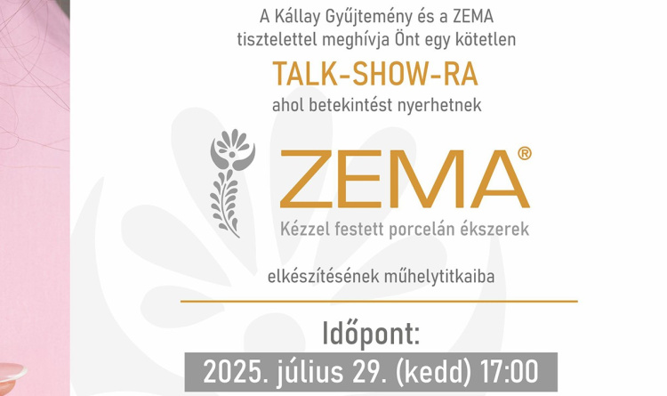 Ismerje meg a ZEMA ékszereket! A kézzel festett porcelán ékszerek elkészítésének műhelytitkaiba vezetik be az érdeklődőket. Egy nem hétköznapi Talk-Show-ra hívják a közönséget a Kállay Gyűjteménybe.