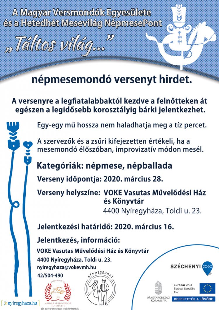 A Vasutas Művelődési Házban működő Hetedhét Mesevilág NépmesePont népmesemondó versenyt hirdet. Minden korosztályból várják a jelentkezőket, akik szeretik a meséket, akik szeretnek élőszóban mesét mondani. Jelentkezési határidő: 2020. március 16.