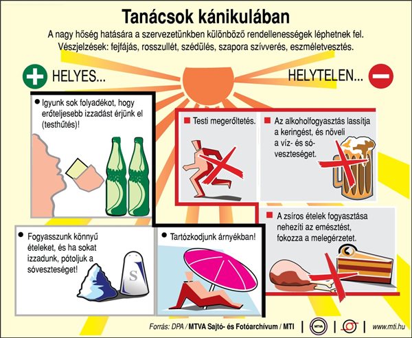 A nagy hőség hatására a szervezetünkben különböző rendellenességek léphetnek fel. Vészjelzések: fejfájás, rosszullét, szédülés, szapora szívverés, eszméletvesztés.