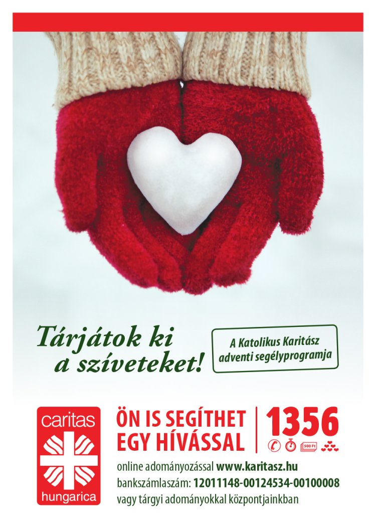 A Katolikus Karitász minden évben meghirdeti Tárjátok ki a szíveteket! elnevezésű adventi adománygyűjtését, arra buzdítva, hogy tárjuk ki a szívünket és adjunk azoknak, akiknek a legkevesebb jut.