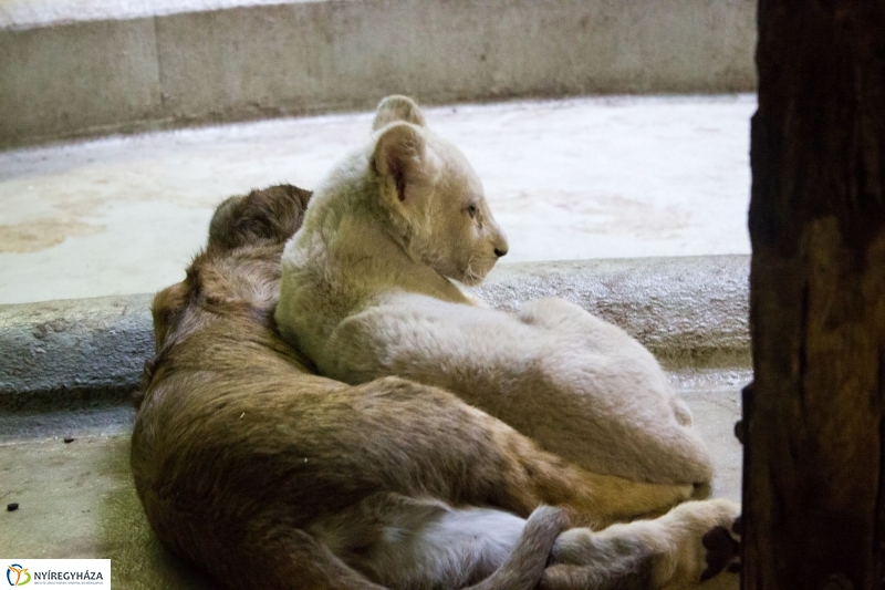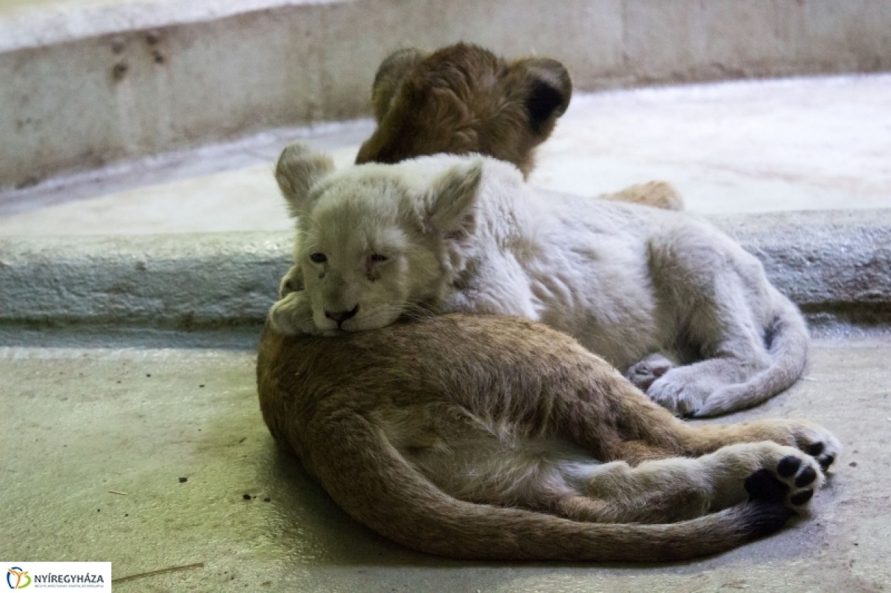 Békésen szundikál a két kis oroszlán a Nyíregyházi Állatpark Viktória házában. A közelmúltban lettek lakótársak, ugyanis a jelenleg 11 hetes fehér kölyök eddig egyedül élt beltéri kifutójában. Őt három hetes korától ember gondozza, ugyanis édesanyja nem tudta táplálni.