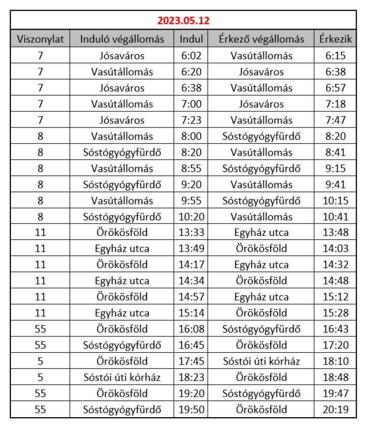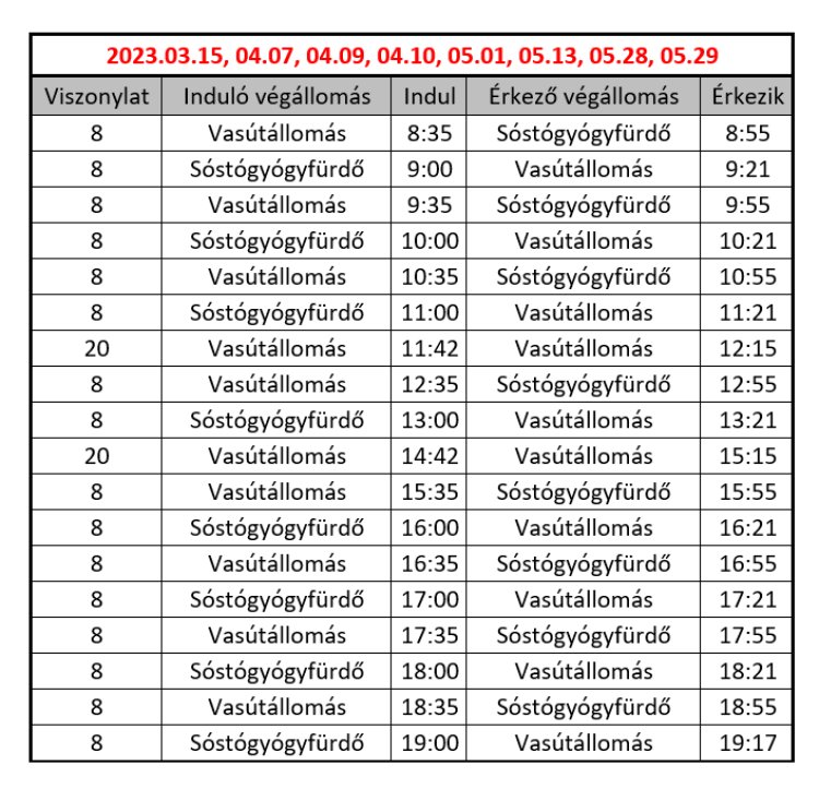 Az autóbusz az alábbi menetrend szerint fog közlekedni: