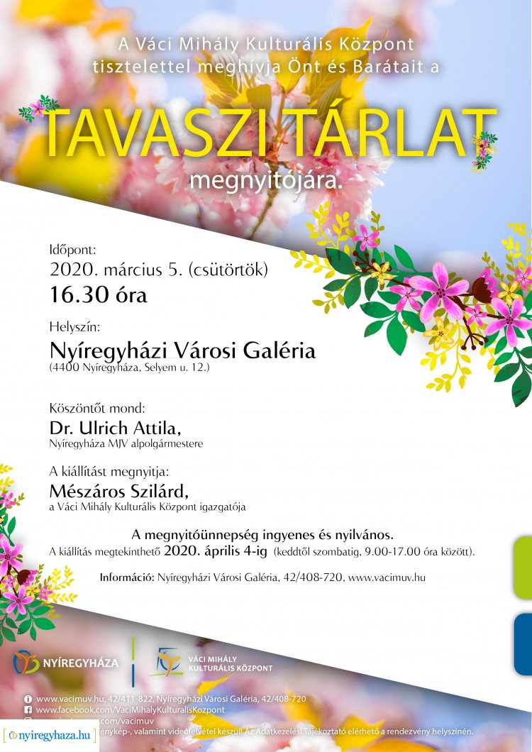 Tizenöt Nyíregyházán élő, hivatásos képzőművész alkotásai láthatók március 5-től a Nyíregyházi Városi Galériában. A Váci Mihály Kulturális Központ másodszor hirdette meg témamegkötés nélkül a nyíregyháziak Tavaszi Tárlatát. A grafikák, festmények, érmek és kerámiák április 4-ig fogadják a látogatókat.