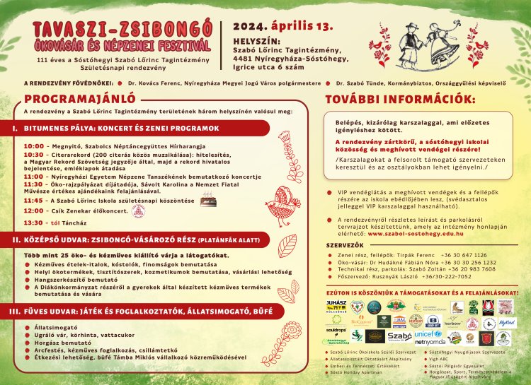 Az idén 111 éves sóstóhegyi iskola udvarára, három helyszínre több tucat programot szervezett a Sóstóhegyi Közművelődési Színtér. Tíz órakor a napot a Szabolcs Néptáncegyüttes ünnepi műsora nyitja meg, majd egy rekordkíséretre kerül sor. 220 citerás közös muzsikálásba kezd, amit a Magyar Rekordok Szövetsége hitelesít. Ezt követi a Nyíregyházi Egyetem Népzene Tanszékének koncertje, ami után a képzőművészet kerül a középpontba. Az öko- rajzpályázat eredményhirdetésén izgulhatnak a pályázók, ahol Sávolt Karolina, a Nemzet Fiatal Művésze értékes ajándékait kapják a díjazottak. 12 órától az 1988-ban alakult, Kossuth-díjas Csík Zenekar lép a színpadra és ad élő koncertet.