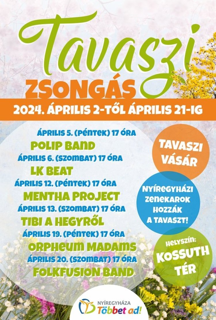 A hagyományokhoz hűen, idén is megrendezik a Tavaszi Zsongást Nyíregyházán. Április 2-a és 21-e között tavaszi vásárral és zenés színpadi produkciókkal teszik még hangulatosabbá a Kossuth teret. A rendezvény ideje alatt hat alkalommal zenétől lesz hangos a belváros, a koncertek péntekenként és szombatonként színesítik a programot. A vásári forgatag pedig mindennap várja a nyíregyháziakat és a városunkba érkező turistákat.