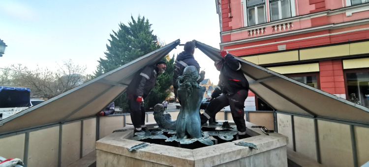 A kora reggeli, csípős hidegben végezték el a NYÍRVV Nonprofit Kft. munkatársai a belvárosi Három Grácia szökőkút szokásos téli lefedését. A fagy elleni védelem minden évben elengedhetetlen feladat, ám idén különlegessé tette a munkát, hogy a szökőkút védőburkolata teljesen megújult.