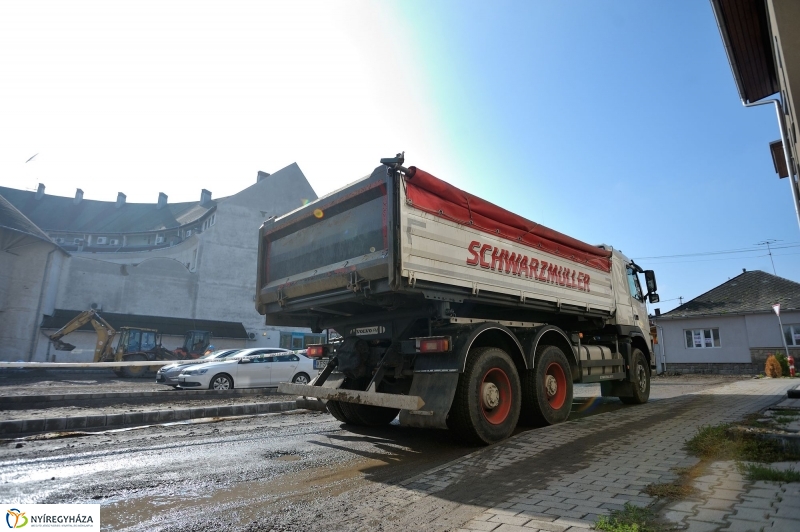 – A villanyoszlopig aszfaltozunk, utána pedig az Univerzum másik sarkáig térkövet rakunk le – a kivitelező KE-VÍZ 21 projektvezetője, Raska István mutatta meg Nyíregyháza városvezetésének az üzlet mögötti munkálatokat. Azt is hozzátette, hogy a napokban az erős esőzés miatt szünetelt a munkavégzés, de a jó időnek köszönhetően újra dolgozni kezdtek a gépek.