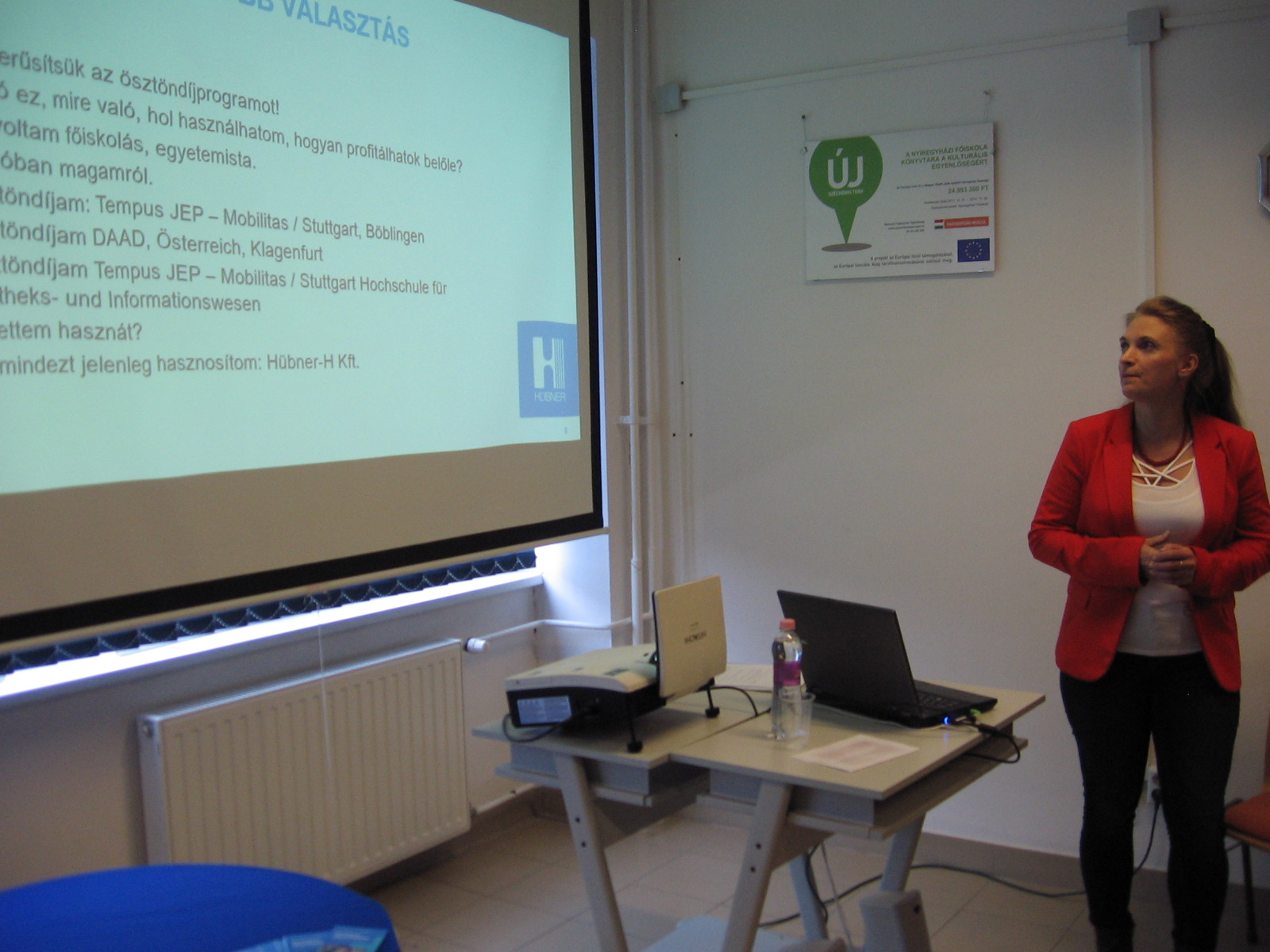 A rendezvény során először Dudás Éva Erasmus koordinátor tartott általános tájékoztatót a Nyíregyházi Egyetem külföldi partnerintézményeiben elérhető hallgatói és dolgozói ösztöndíj lehetőségekről. Az előadás során kitért több, a hallgatókat foglalkoztató kérdésre, így elmondta az Erasmus+, és a Campus Mundi programokhoz kapcsolódó jelentkezési feltételeket is. Külön kiemelte azt a tényt, hogy a hallgatók kiutazásuk előtt támogatást kapnak idegennyelvi felkészülésükhöz.
