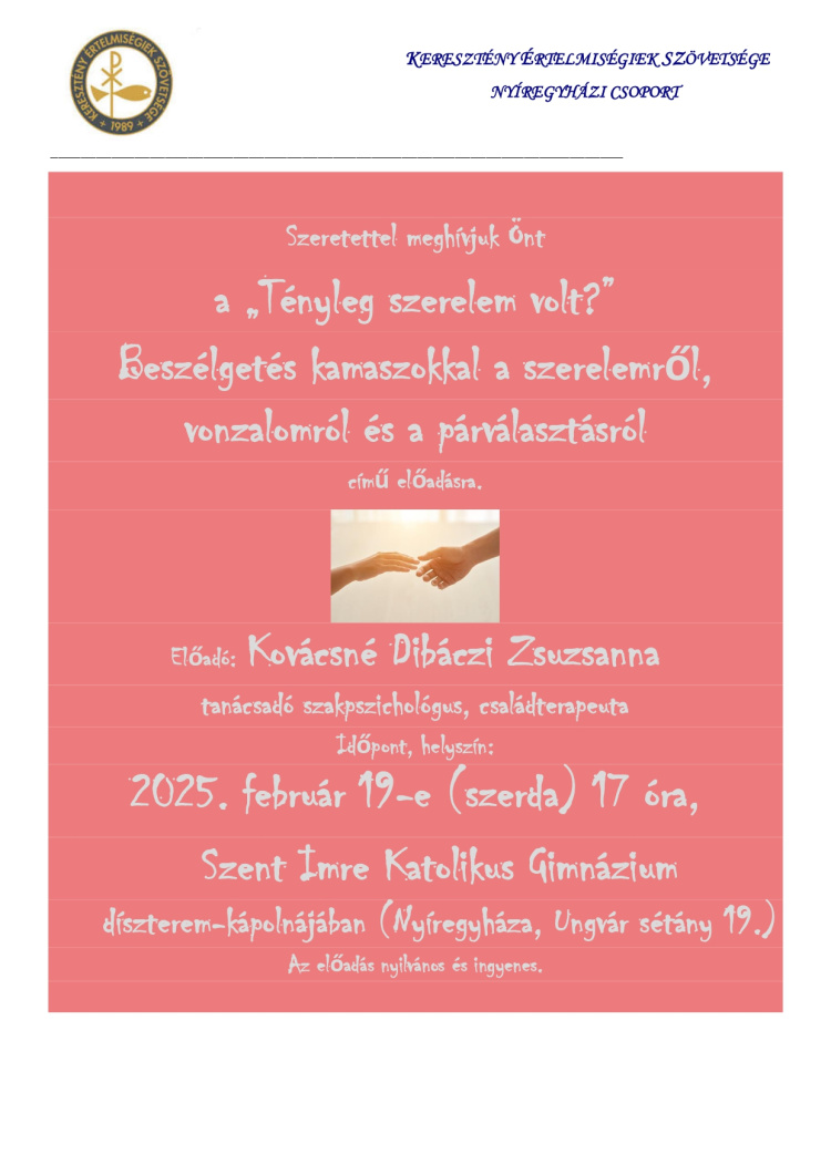 Beszélgetés kamaszokkal a szerelemről, vonzalomról és a párválasztásról címmel 2025. február 19-én, szerdán, 17.00 órakor a Szent Imre Katolikus Gimnázium díszterem-kápolnájában.
