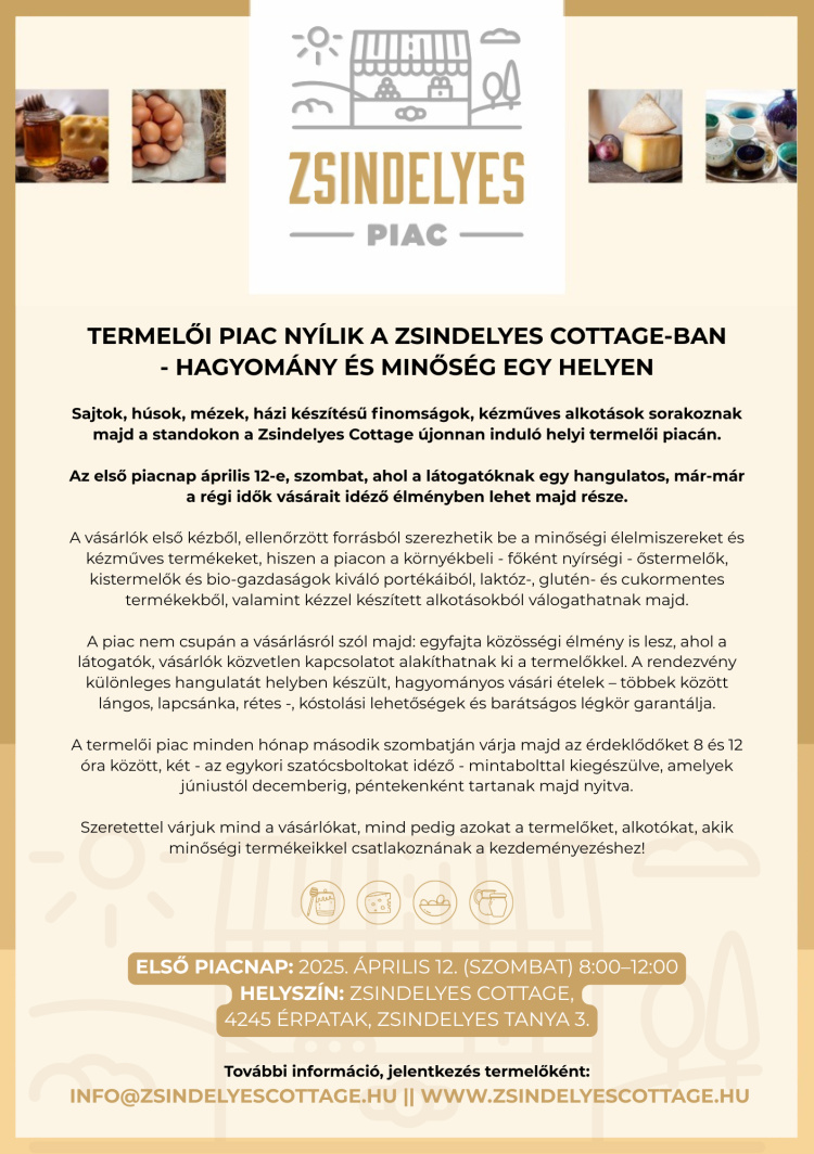 Helyi termelői piac indul Nyíregyháza közelében. A helyszíne a sokak által ékszerdoboznak tartott Zsindelyes Cottage lesz. Az első piacnap április 12-e, szombat, ahol a látogatóknak egy hangulatos, már-már a régi idők vásárait idéző élményben lehet majd része.