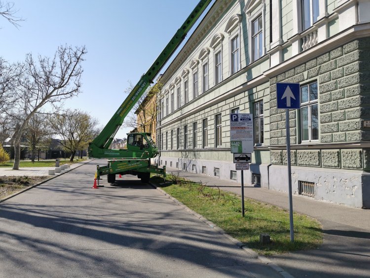 Hetekkel ezelőtt a viharos szél megrongálta a Kölcsey Ferenc Gimnázium tetőszerkezetét. Csütörtökön egy speciális emelő segítségéval a szakemberek kijavították a hibát. A munkálatok ideje alatt forgalomkorlátozás volt érvényben.