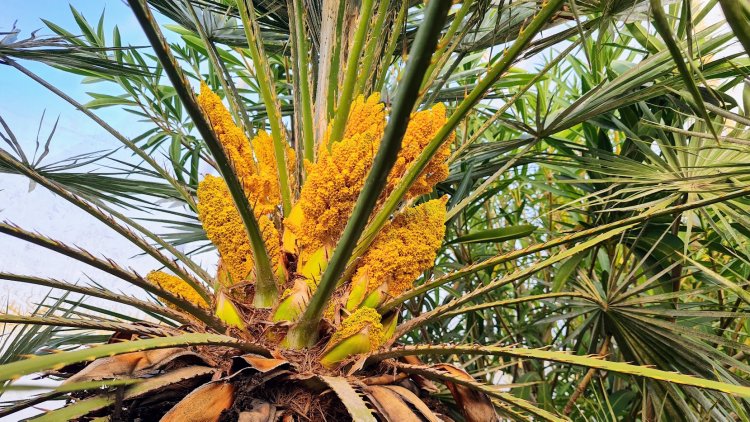 Csodálatos, sárga virágot bontottak a legyezőpálmák telelő helyükön, a Tüzér utcai hatalmas fóliasátorban!
