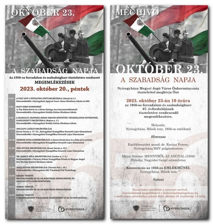 Az önkormányzati ünnepi megemlékezés október 23-án (hétfőn) 10:00 órakor lesz Nyíregyházán a Hősök terén, az 1956-os emlékműnél.