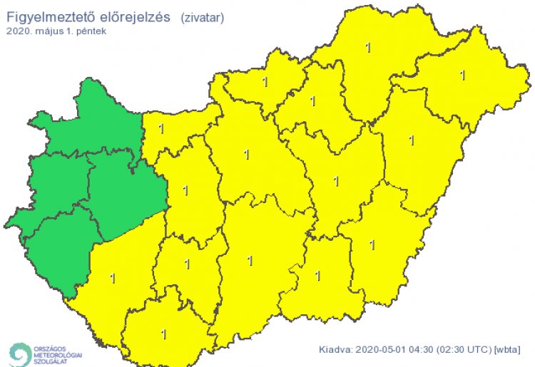 Az OMSZ arra figyelmeztetett: zivatar alakulhat ki. Az elsődleges veszélyforrást a villámlás jelent, emellett esetenként szélerősödés, jégeső előfordulhat.