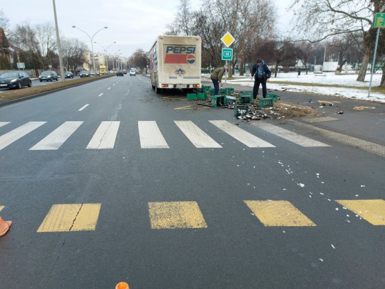 Tizenöt rekesz zuhant az útra a Széna téren egy kanyarodó teherautóról