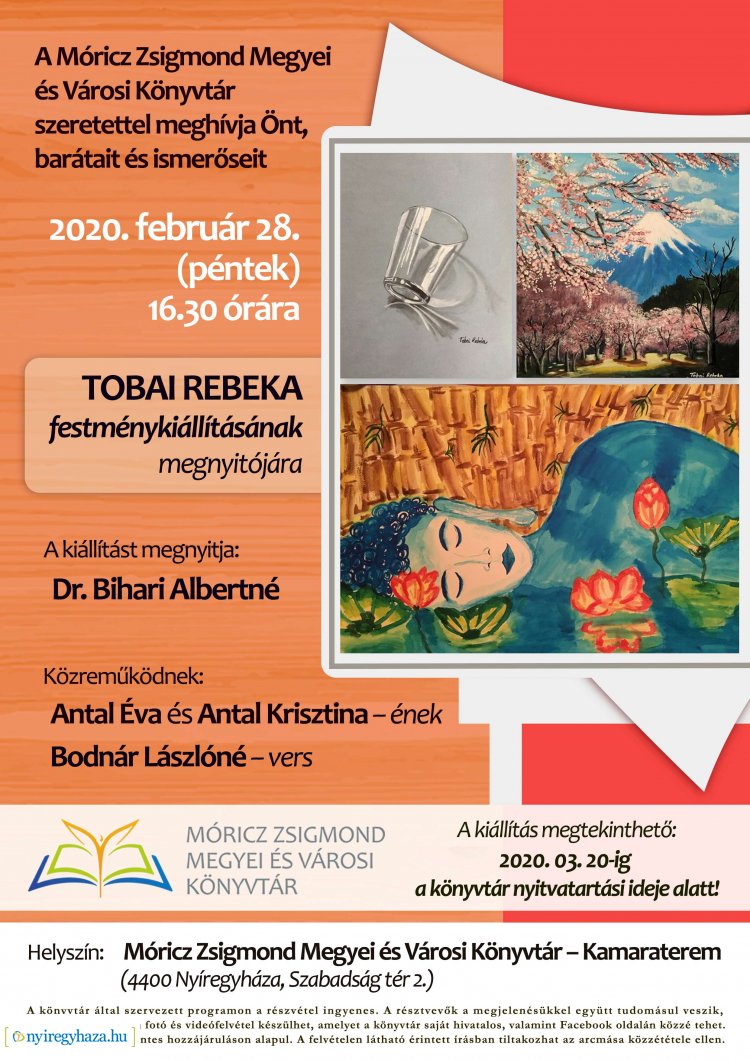 Tobai Rebeka mutatkozik be festményeivel február 28-tól Nyíregyházán. A tárlat március 20-ig fogadja a látogatókat a Móricz Zsigmond Megyei és Városi Könyvtárban.