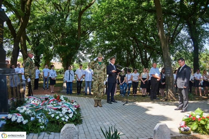 A megemlékezés a Hősök terén, az I. világháborúban elesett katonák emlékművénél folytatódott, ünnepi beszédet mondott Dr. Ruszin Romulusz dandártábornok. Az 5. Bocskai István Lövészdandár parancsnoka kiemelte, a magyar katona 1100 éves történelmünk során többször mutatott példát hazaszeretetből, a mai magyar katonák pedig ugyanazokat az értékeket képviselik, most a déli határon, Irakban Afganisztánban, Koszovóban látják el feladatukat.