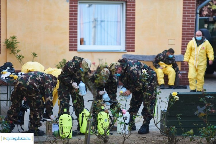 - A Petőfi Sándor vegyvédelmi zászlóalj két hete még csak gyakorlatozott, most pedig már éles bevetésben vagyunk – hangsúlyozta Urbán Levente. A százados elmondta, a honvédség mindent megtesz annak érdekében, hogy csökkentsék a megbetegedések számát. - Április 12-én végeztük el az első idősotthon fertőtlenítését, majd kórházakban is gyakorlatot szereztünk. Most is ez alapján végezzük a feladatot. Nyíregyházán két ütemben hajtjuk végre a fertőtlenítést. Egyszer egy melegköd képzős hidrogén peroxid és nátrium hipokloritból alapú fertőtlenítőszerrel dolgozunk, majd a második körben a MOL által gyártott speciális fertőtlenítőszerrel permetezünk, ez érinti a szobákon kívül természetesen, a vizesblokkokat, az orvosi helyiséget is…