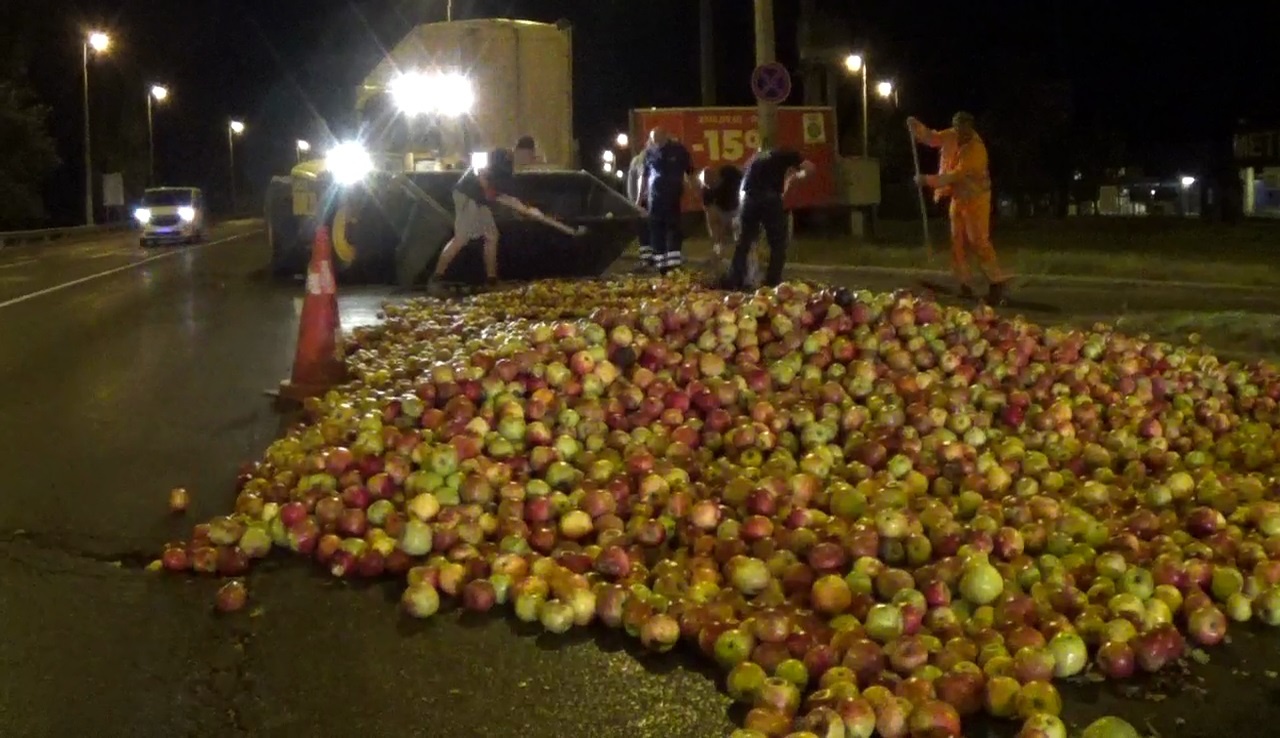 Több mint három tonna alma került a 4-es főútra egy hirtelen kanyarodó teherautóról.