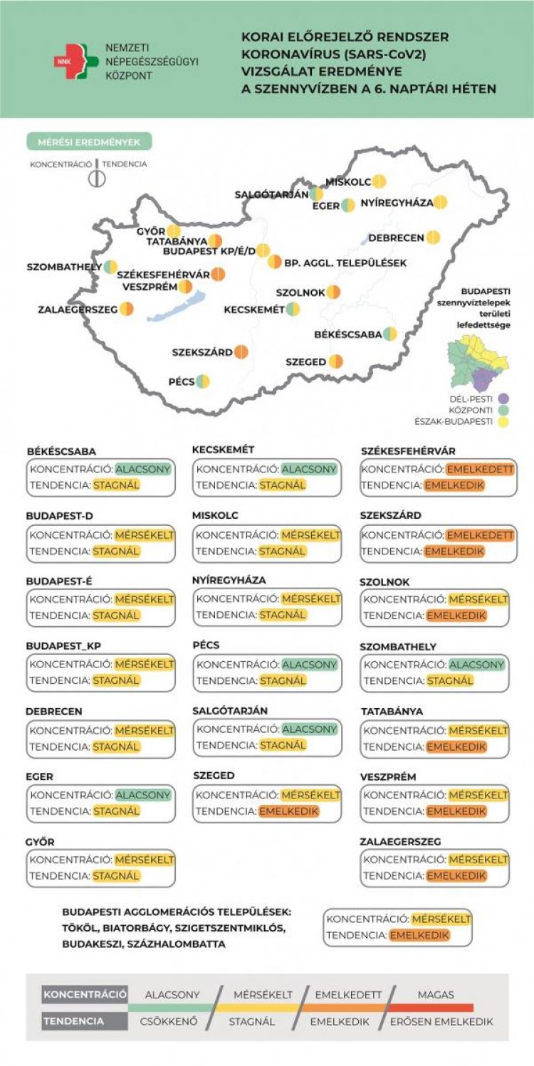 Szegeden, Székesfehérváron, Szekszárdon, Szolnokon, Tatabányán, Veszprémben, Zalaegerszegen, valamint az 5 vizsgált Budapest környéki település (Tököl, Biatorbágy, Szigetszentmiklós, Budakeszi, Százhalombatta ) közös mintájában is nőtt a SARS-CoV-2 örökítőanyagának koncentrációja. Így két településen (Székesfehérvár és Szekszárd) ismét az emelkedett, míg Békéscsabán, Egerben, Kecskeméten, Pécsett, Salgótarjánban és Szombathelyen továbbra is alacsony kategóriába sorolható a koncentráció.