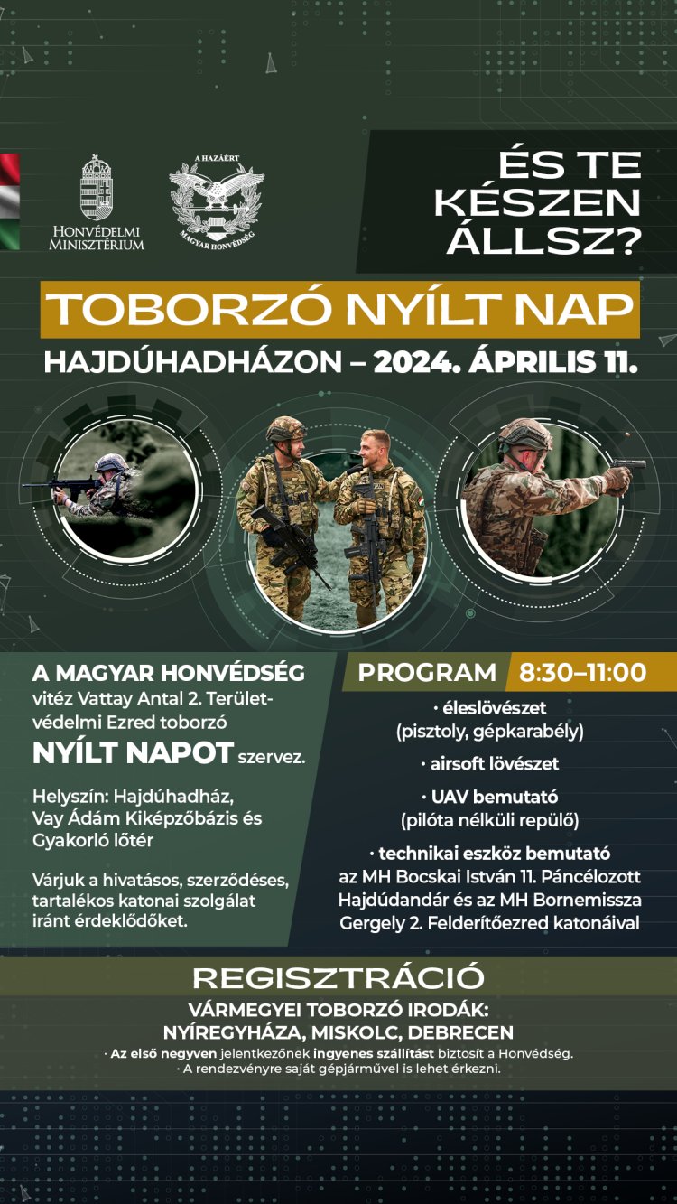 A Magyar Honvédség vitéz Vattay Antal 2. Területvédelmi Ezred 2024. április 11-én toborzó nyílt napot tart a hajdúhadházi Vay Ádám Kiképzőbázis Gyakorló-és lőtéren, ahová várják a hivatásos, szerződéses, tartalékos katonai szolgálat iránt érdeklődőket.