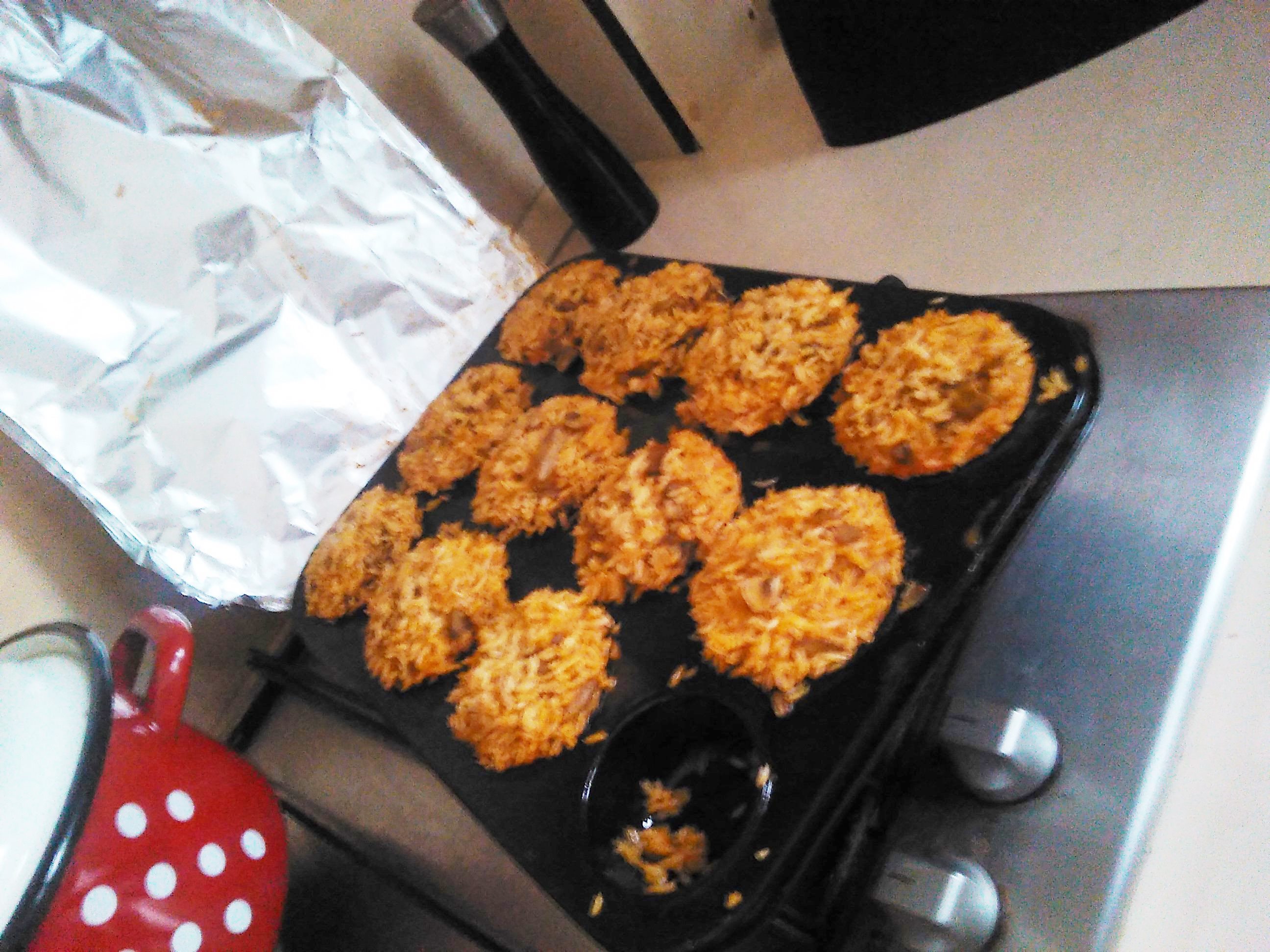 Ekkor szoktunk szembesül azzal, hogy elszámoltuk magunkat, és megmaradt a massza, amivel nem tudunk mit kezdeni. Én gyakran járok így, és a következő dolog jutott az eszembe egy alkalommal. maffin sütőbe tettem a maradékot olyan formában, hogy alá apró szalonna kockákat vágtam. Persze, ez már nem a vegetáriánusoknak lesz. Rákanalaztam a masszát úgy, hogy félig lepje el a formát. Aztán a paradicsomlével felöntöttem. Alufóliát tettem rá, és a sütőbe tettem. Persze, mindenki kíváncsian várta, mi sül ki belőle, így gyakran megnézegettem. Menet közben egyszer-kétszer még meglocsoltam paradicsomlével, hogy biztos megpuhuljon benne a rizs, hiszen ahhoz kell a nedvesség. A végeredmény meglepően finom, és dekoratív étel lett, melyet tejföllel, vagy a töltött paprika paradicsom szószával is lehet tálalni.