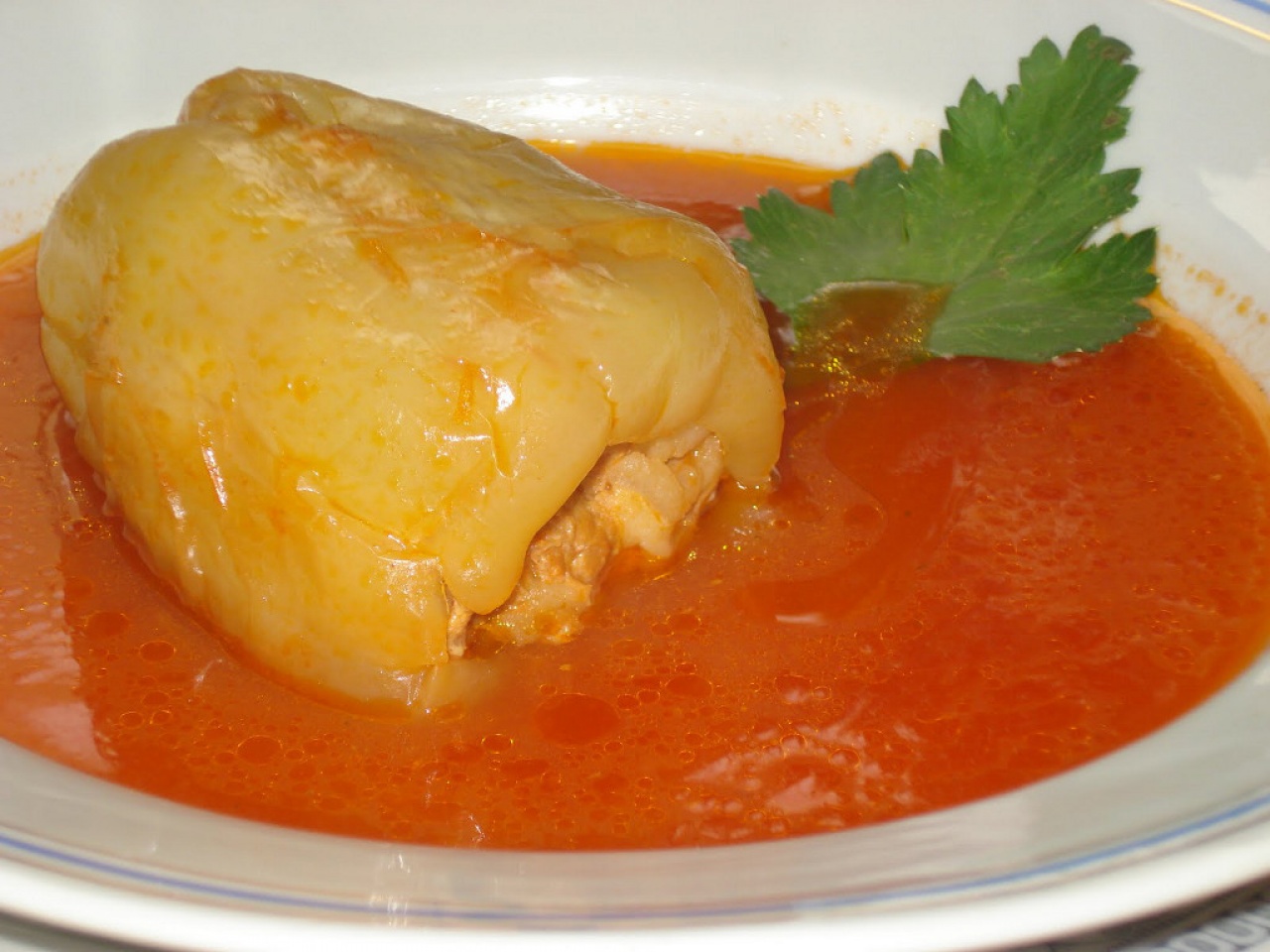 De térjünk vissza a töltött paprikánk további elkészítéséhez: A paradicsomlét (vagy az 1 l hideg vízzel elkevert, sűrített paradicsomot) 1 kávéskanál sóval, a cukorral felforraljuk. Beletesszük a paprikákat, és mérsékelt tűzön, félig lefedve puhára főzzük (kb. 30 perc). Nem kevergetjük, csak meg-megrázogatjuk a lábast! Aki szereti sűrű szósszal, az a paprikákat óvatosan vegye ki szűrőkanállal, és az edénybe lévő paradicsomos levet sűrítse liszttel ízlés szerint. Visszatesszük a mártásba a paprikákat, éppen csak összeforraljuk, ízlés szerint utánasózzuk, végül mély tálba szedjük, és petrezselyemmel díszítjük.