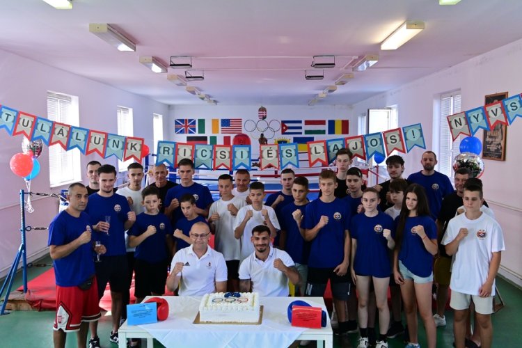 Gratulálunk Ricsi és Lajos! Ezzel a felirattal fogadta klubja, az NYVSC Kovács Richárd ökölvívót és edzőjét, Nagy Lajost a bokszteremben. A nyíregyházi versenyző 5. lett az olimpián, most pedig tortával és pezsgővel várták a csapat tagjai. Elsőként a dísz fogyott el az édességről, mely egy marcipán bokszkesztyű volt...