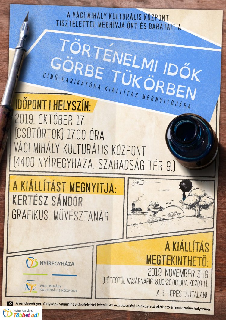 Történelmi idők görbe tükörben címmel karikatúra kiállítás nyílik október 17-én a Váci Mihály Kulturális Központban. Kertész Sándor grafikus tárlata november 3-ig látogatható.