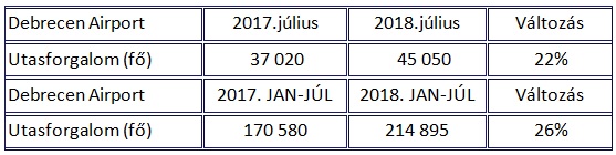 2018. júliusában is markánsan fejlődött a Debrecen Airport utasforgalma. Az előző év azonos időszakával összehasonlítva idén júliusban 22 %-kal többen, mintegy 45 050-en keresték fel Magyarország legdinamikusabban fejlődő repülőterét.