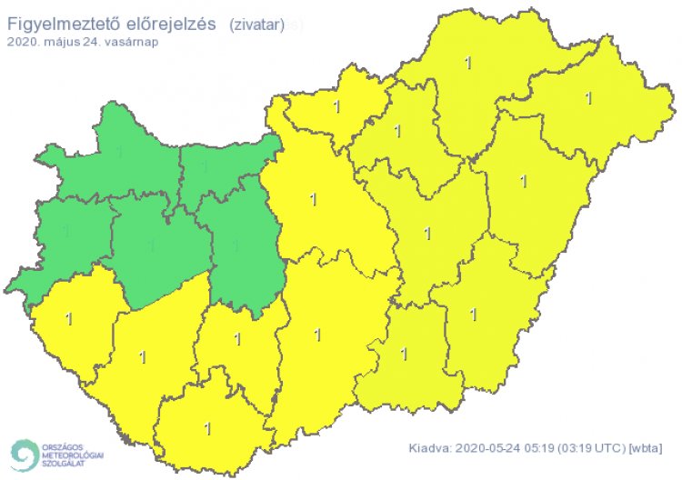 Az OMSZ 14 megyére adott ki első fokú vészjelzést. Figyelmeztetésükben leírják, hogy az érintett megyékben zivatarok alakulhatnak ki. Elsődleges veszélyforrást a villámlás jelent, emellett esetenként szélerősödés, jégeső előfordulhat. A várt legerősebb széllökések meghaladhatják a 70 km/h-t.